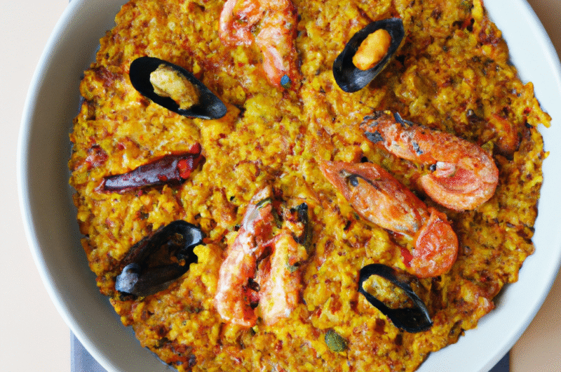 Diese traditionelle spanische Paella ist vollgepackt mit verschiedenen Meeresfrüchten, die ein wunderbar reichhaltiges und befriedigendes Gericht ergeben.