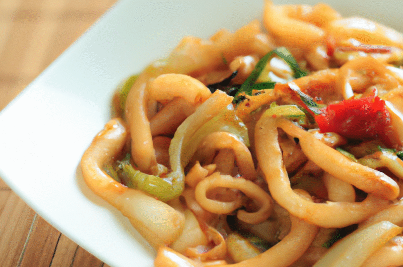 Ein leckeres, japanisches Gericht mit gebratenen Udon-Nudeln und frischem Gemüse.